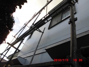 高崎市で、新年最初の足場組立。工事部主任中島、了典、塗装職人(親方)田村の三人で、無事足場組立が終わりました。