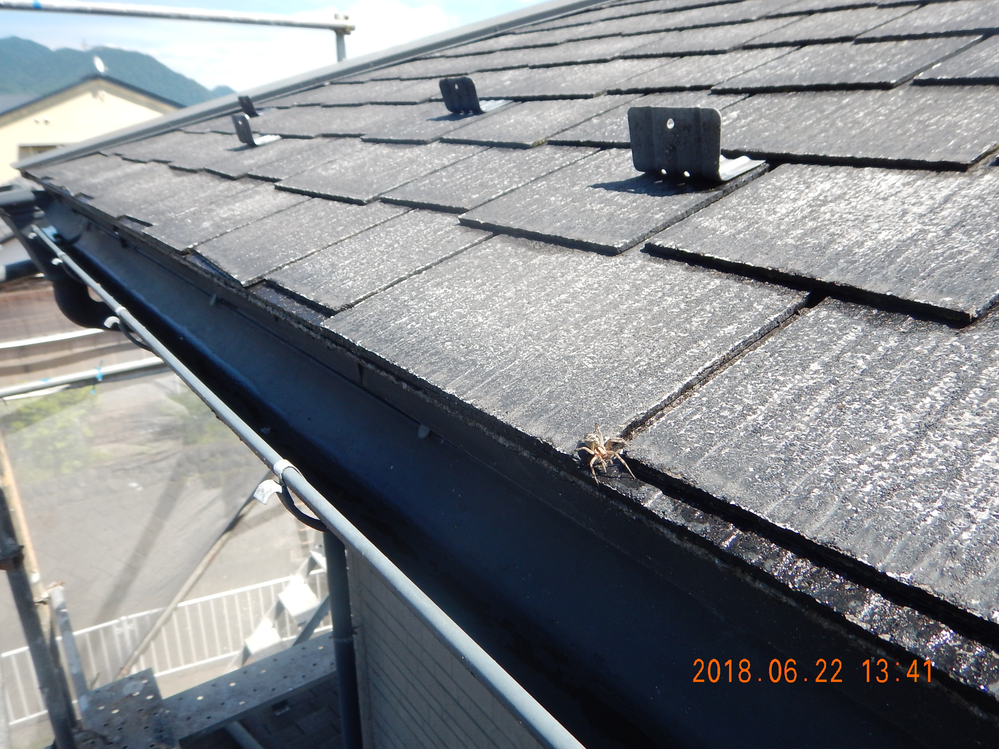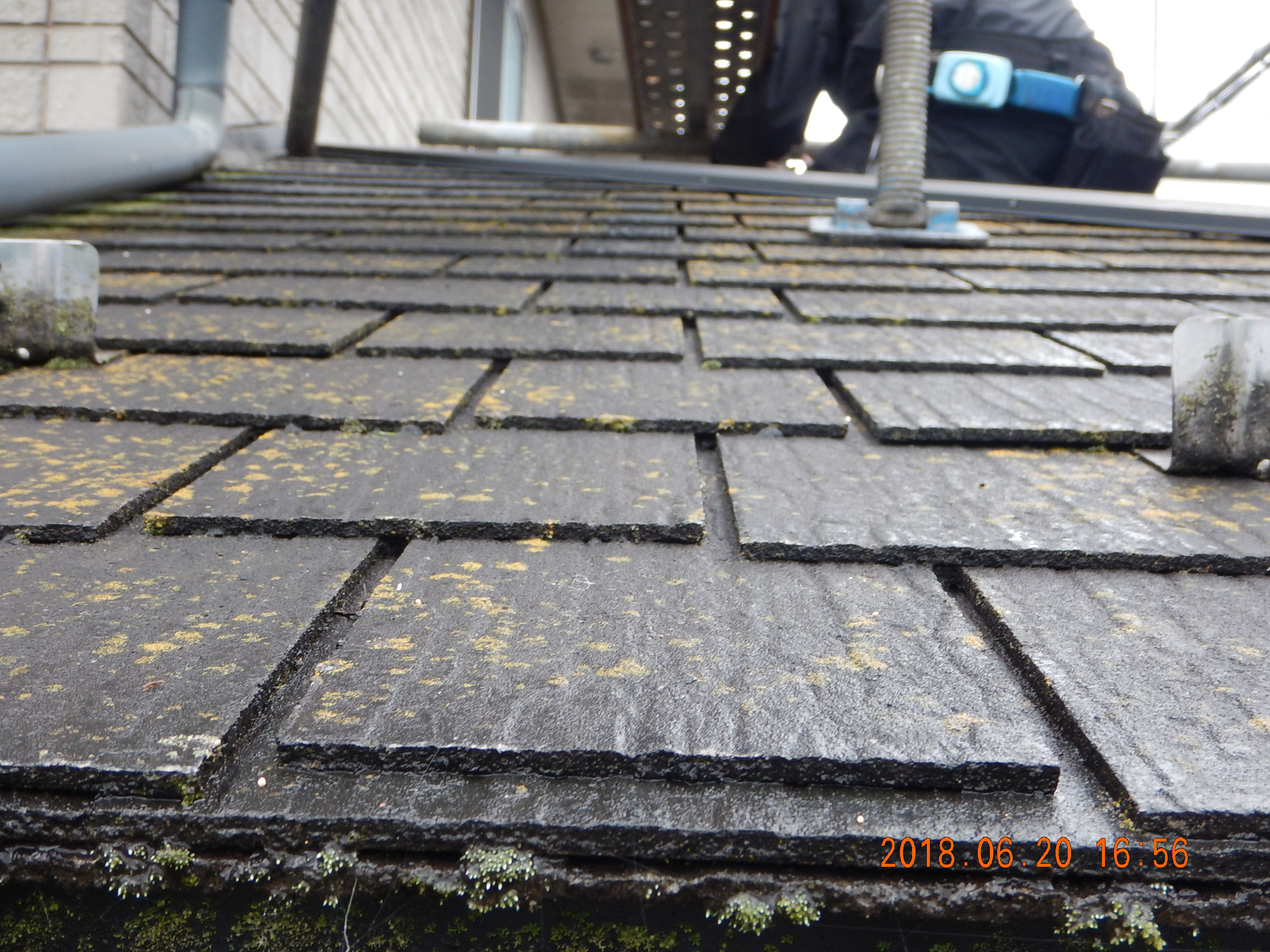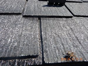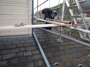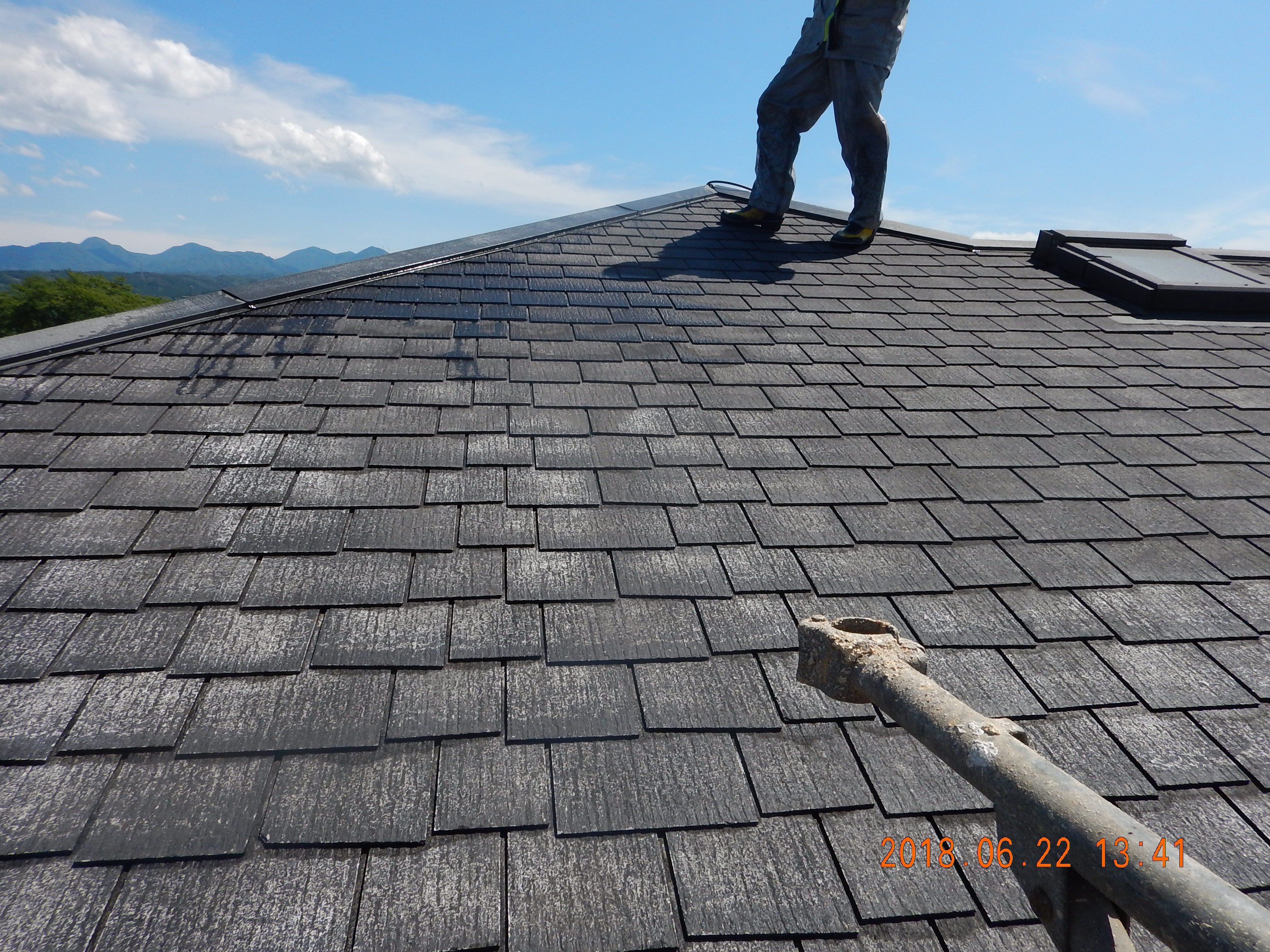 午前中ネットをはり、午後、大屋根から洗浄。一般的なカラーベスト屋根と形状が違い、凹部分の洗浄が大変。