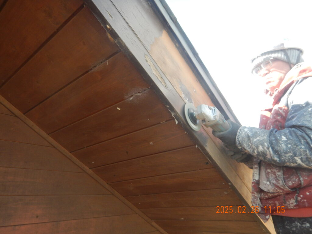 破風板メンテナンス塗装 2025年2月26日 ブログ 施工実績 by kuchikitec. 2015年に外壁塗装したお宅、毎年のように点検訪問していましたが、破風板の剥がれがあまりにひどいと、先月の点検の報告があり、写真を見て私もこれでは悲しい、と思い、社長にお願いして、メンテナンス塗装(無料)をすることにしました。 昨日足場を組み、今日は職人さんが電動サンダーで、可能な限り旧塗膜を剥がす、ケレン作業をしました。 前の記事 次の記事