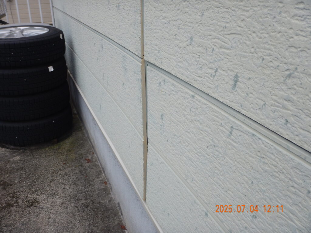 窯業系サイディングの外壁は、防水性がなくなり、サイディングが反り、目地が傷んでいます。さらに、近年の高崎市の雹被害で、外壁には雹による模様が!実は、雹被害、火災保険の対象になります。大雪や強風で雨樋が壊れたとかであれば、完全に保険金が支払われますが、雹被害で外壁が汚れたのは、どうかなと思いましたが、無事保険金も支払われました。