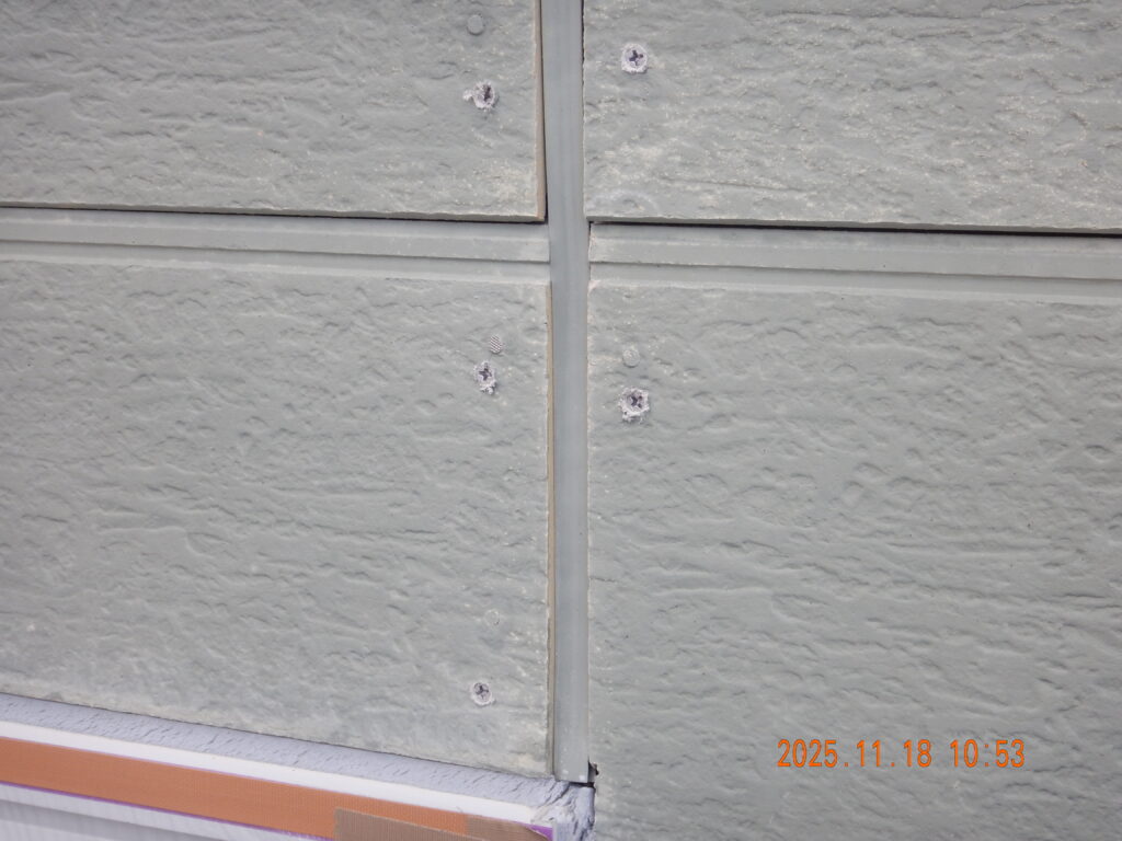現在施工中の、高崎市、外壁、屋根塗装工事現場。足場組立、洗浄、屋根遮熱塗装、外壁補強まで施工。写真(下)は、反った外壁をビス止めしたところ。反りを留める、とともに、外壁補強になります。